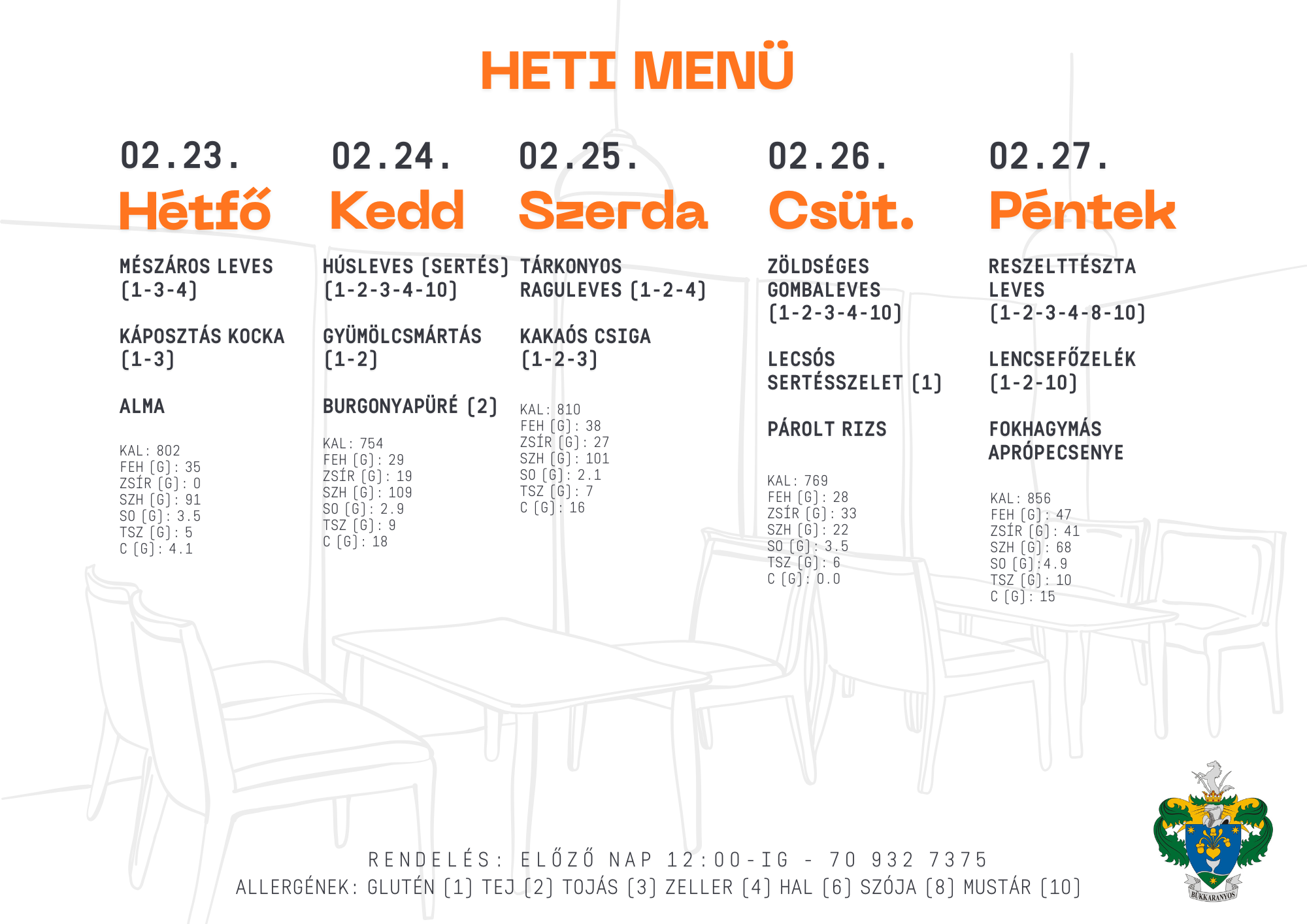 Rendelés előző nap 12:00-ig a 30/432-1352 és a 46/476-352/14 mellék telefonszámokon, átvétel minden nap 12:00 és 14:00 között.
