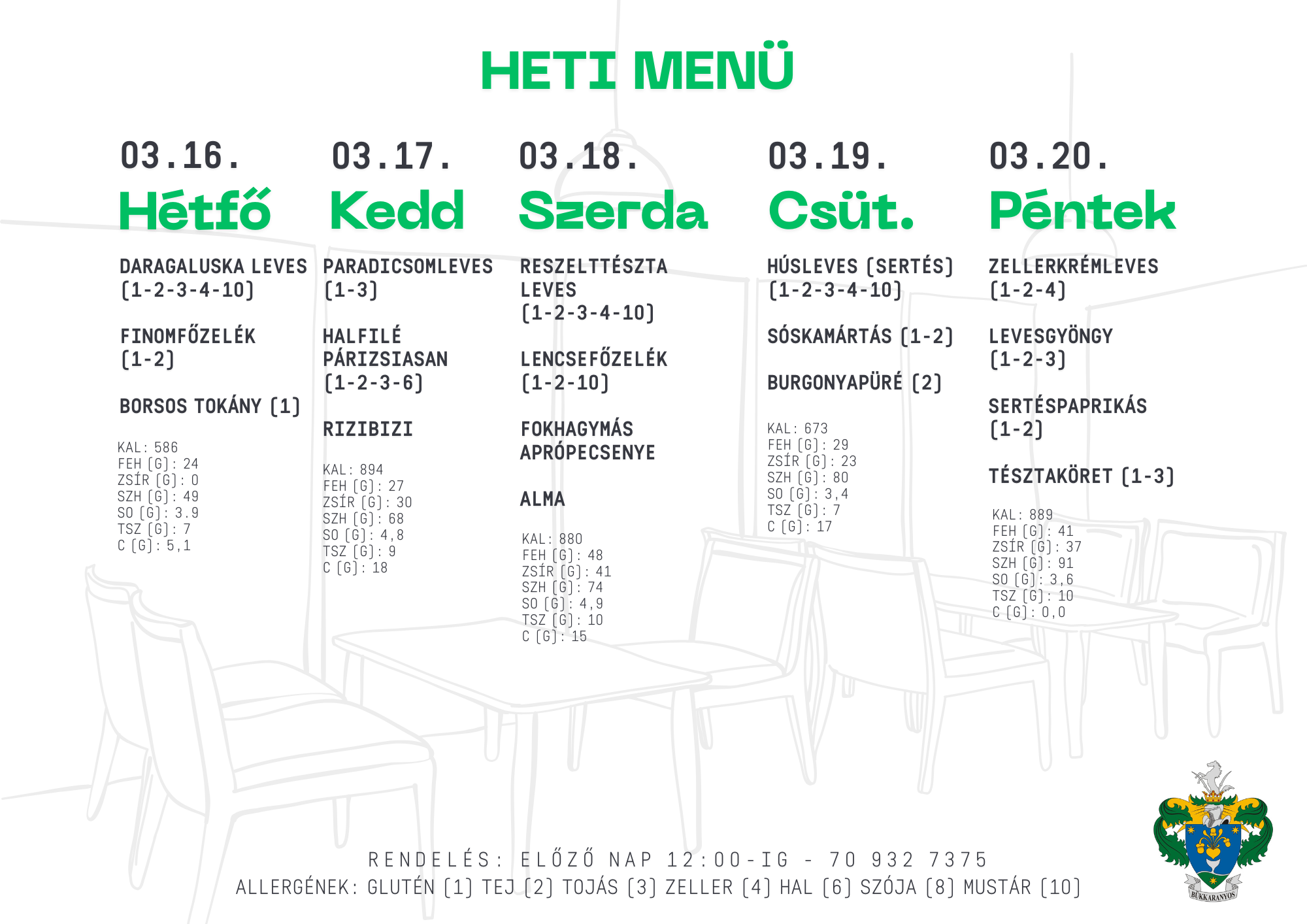 Heti menü (Március 16. – 20.) A Bükkaranyos Kincsei Bölcsőde, Óvoda és Konyha jóvoltából. Rendelés előző nap 12:00-ig a 30/432-1352 és a 46/476-352/14 mellék telefonszámokon, átvétel minden nap 12:00 és 14:00 között. Vissza a Hírekhez Vissza a Főoldalra