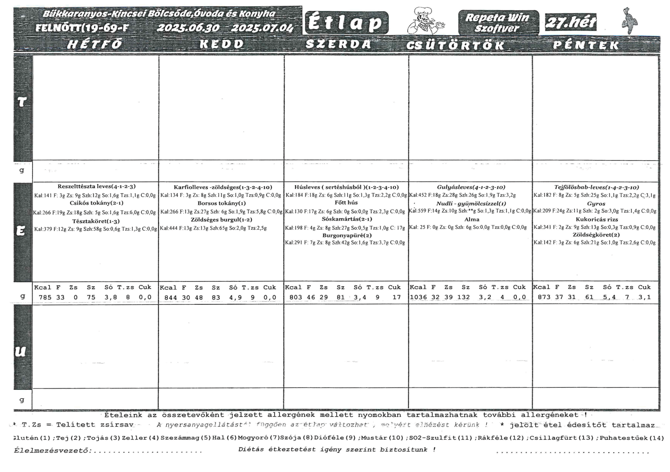 Heti menü (Június 30. – Július 4.)