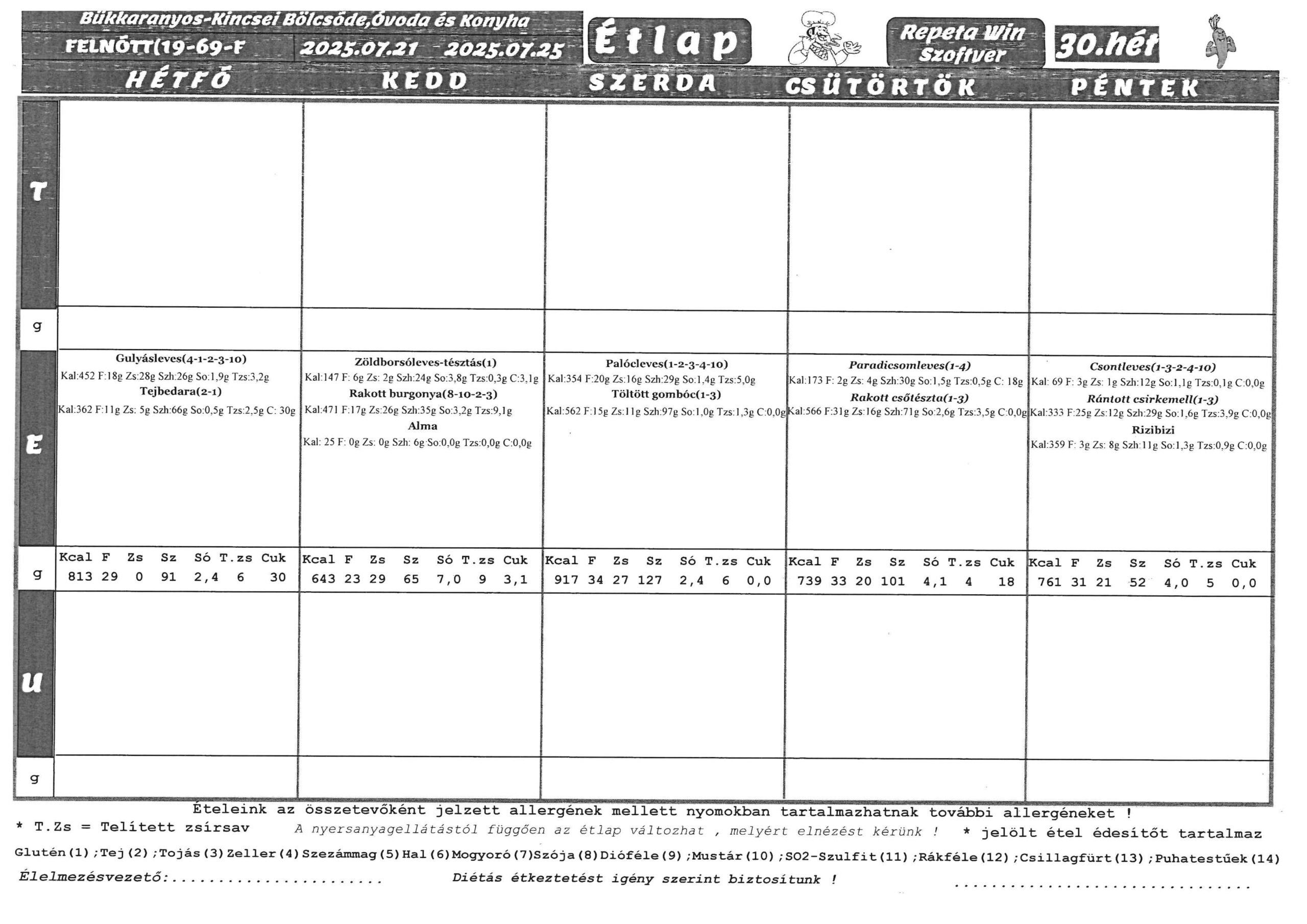 Heti menü (Július 21. – Július 25.) A Bükkaranyos Kincsei Bölcsőde, Óvoda és Konyha jóvoltából. Rendelés előző nap 12:00-ig a 30/432-1352 és a 46/476-352/14 mellék telefonszámokon, átvétel minden nap 12:00 és 14:00 között. Vissza a Hírekhez Vissza a Főoldalra