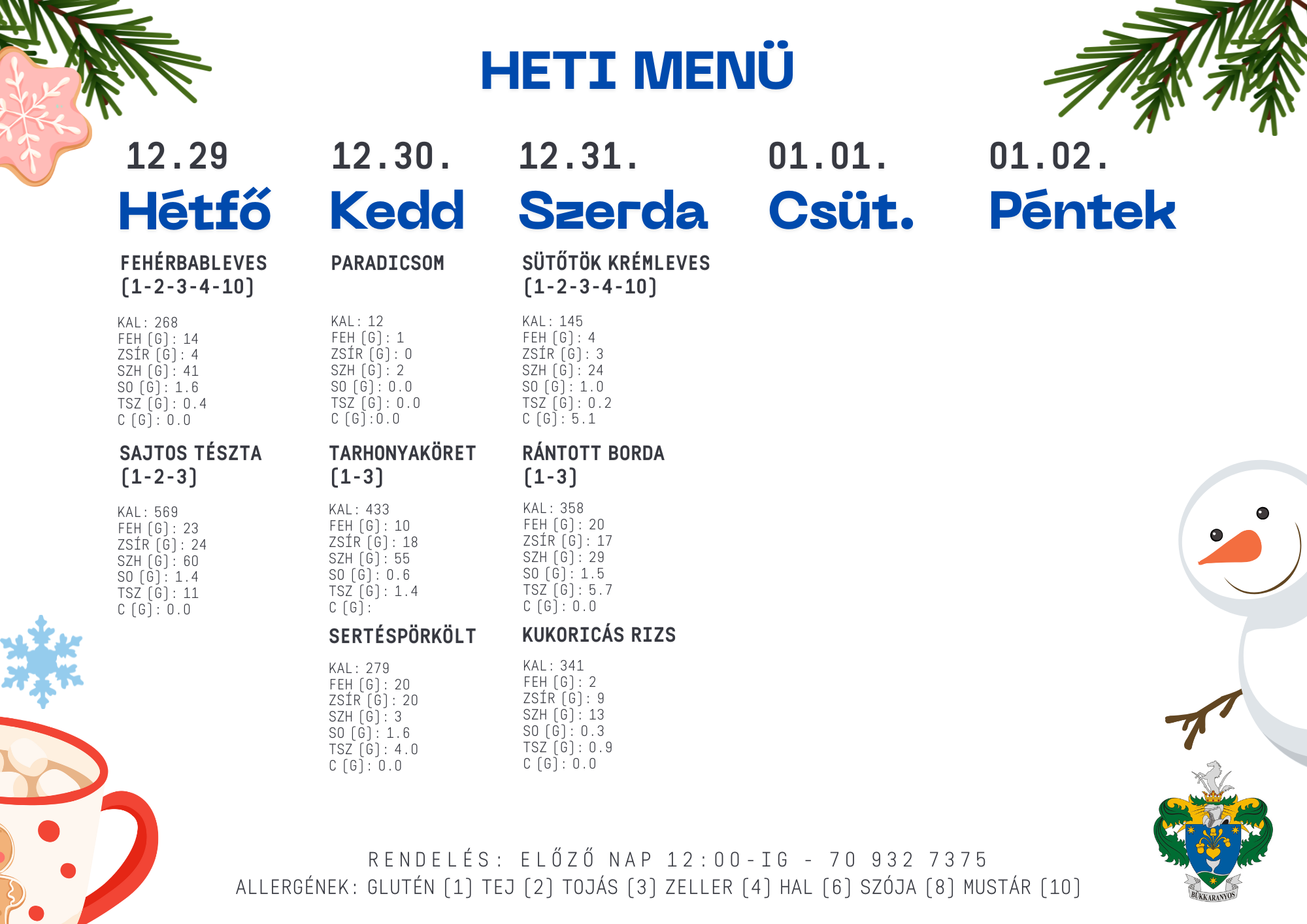 Rendelés előző nap 12:00-ig a 30/432-1352 és a 46/476-352/14 mellék telefonszámokon, átvétel minden nap 12:00 és 14:00 között.